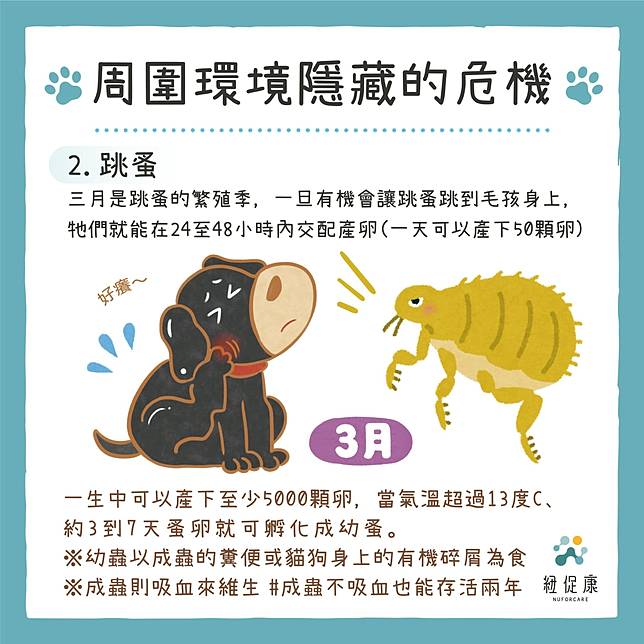 三月是跳蚤的繁殖季,一旦有機會讓跳蚤跳到毛孩身上,牠們就能在24至48小時內交配產卵 『一天可以產下50顆卵』,跳蚤一生中可以產下至少5000顆卵,當氣溫超過13°C、約3到7天蚤卵就可孵化成幼蚤。
