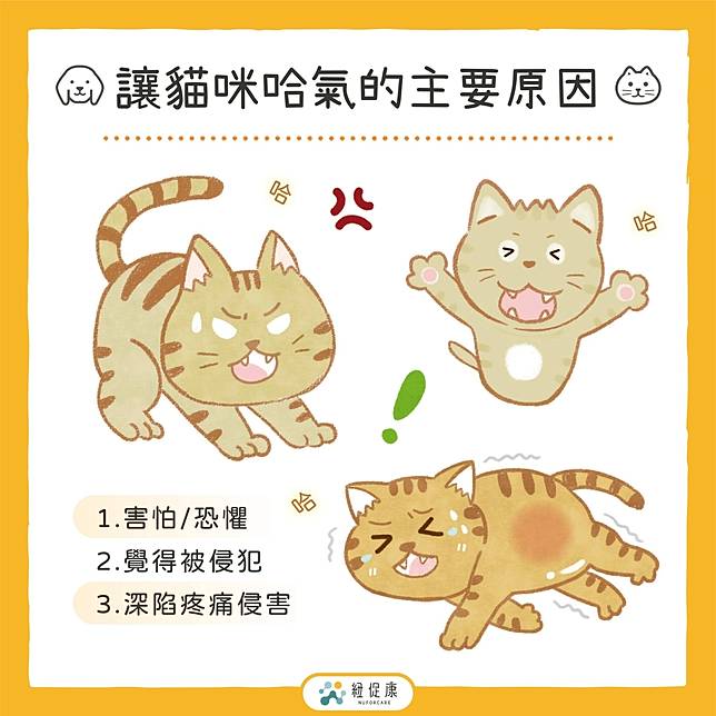 當貓咪感受到身體疼痛時,情緒會處於脆弱不安的狀態,此時的貓咪基於自衛的本能,也會用哈氣來嚇阻想靠近的人事物,避免觸碰所產生的疼痛。如果平常撫摸貓咪時都不會有哈氣的狀況,卻忽然在觸碰某個地方而貓咪有哈氣的情況時,可能就是貓咪身體出現了不適的情況!!奴才們也千萬不要忽視這種症狀,務必記錄下這些異常的行為、症狀,在診斷貓咪身體狀況時能供醫生參考。