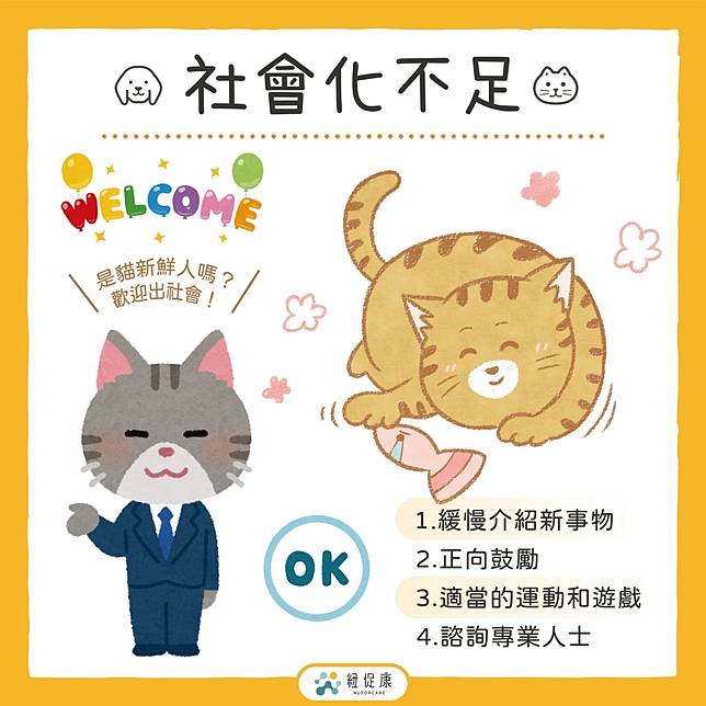 許多貓咪在1歲前會透過接觸不同環境及其他生物,幫助他們習慣這個整個社會互動的方式,所以若社會化不足的情況下,貓咪可能會為了「沒有接觸過的事物」,而感到害怕、合不來、無法適應等…情況發生,建議這種情況可以多注意,並透過以下方式協助貓貓